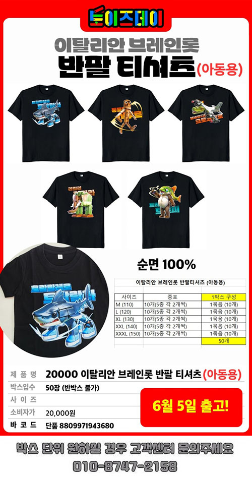 | 품명/모델명 | 품명:완구 / 모델명: 이탈리안 브레인롯 반팔 티셔츠(아동용) | ||